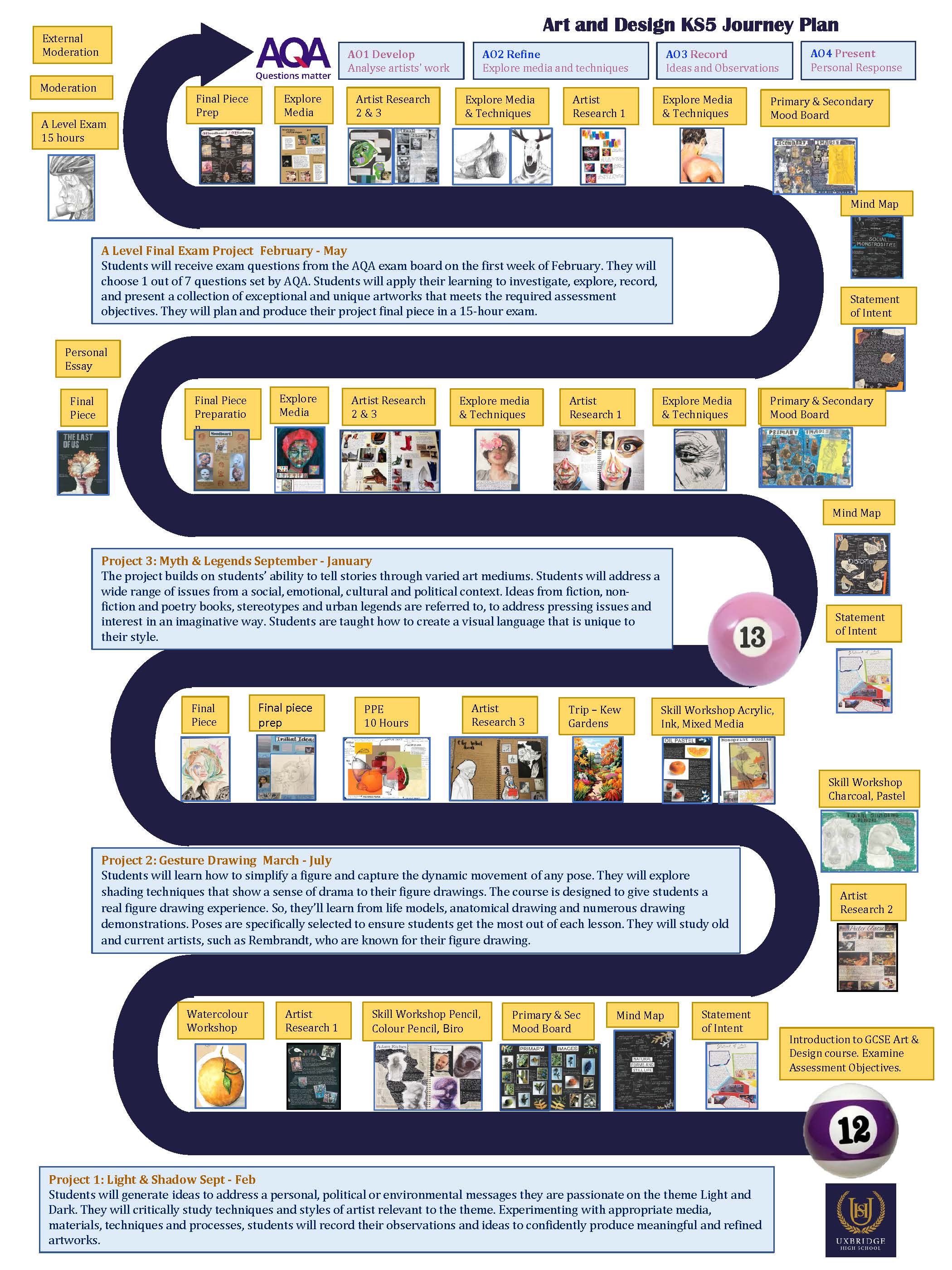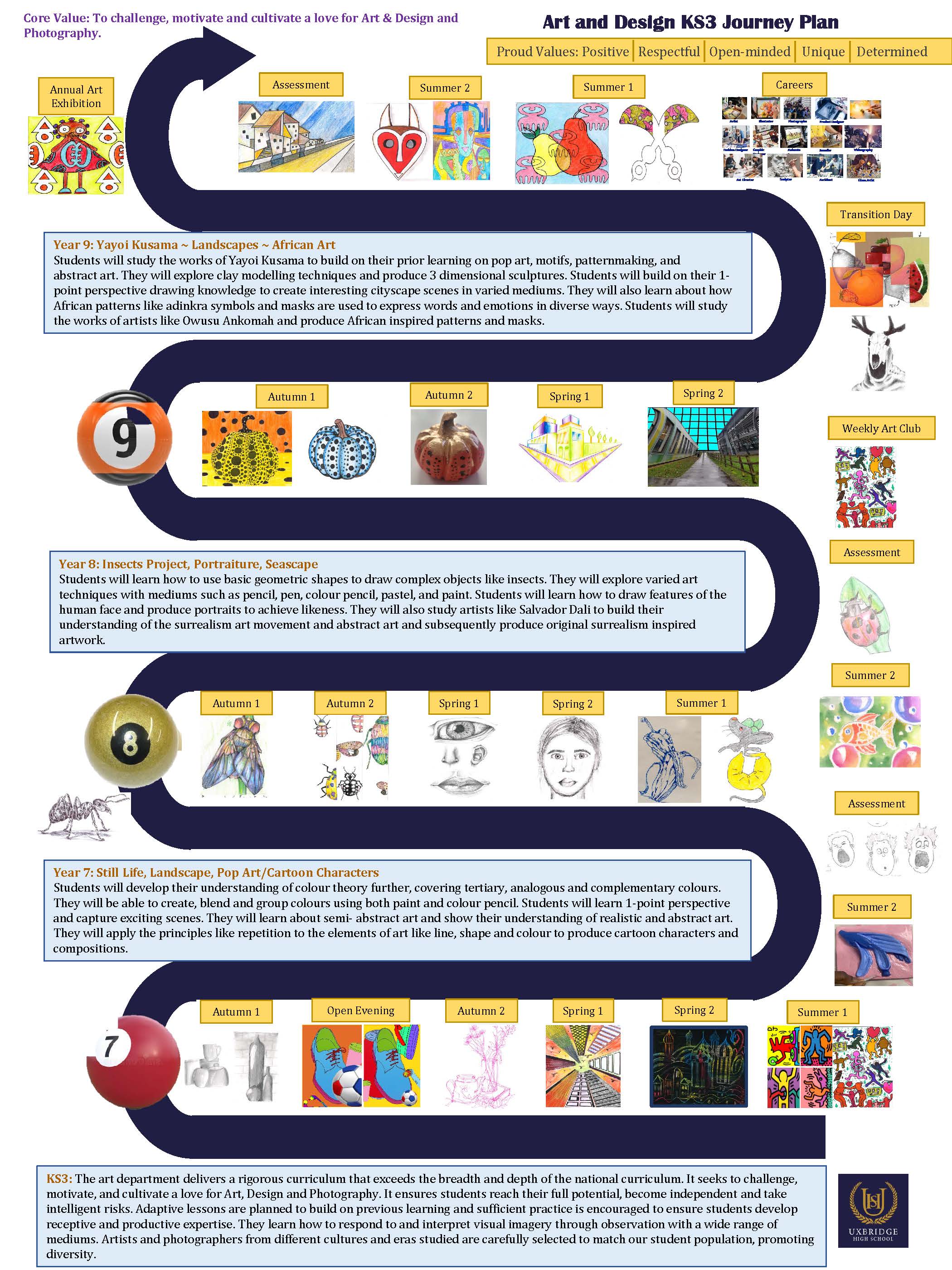 The Art department delivers a broad, vigorous curriculum that exceeds the breadth and depth of the national curriculum. It is designed for students to gain a thorough and practical/theoretical understanding of what it is to be an artist and the value of creativity in an ever-evolving world. It seeks to unlock the full potential of our students and encourages them to take intellectual risks in a supportive environment. Art challenges industry-wide perceptions and encourages students to think beyond the classroom.
