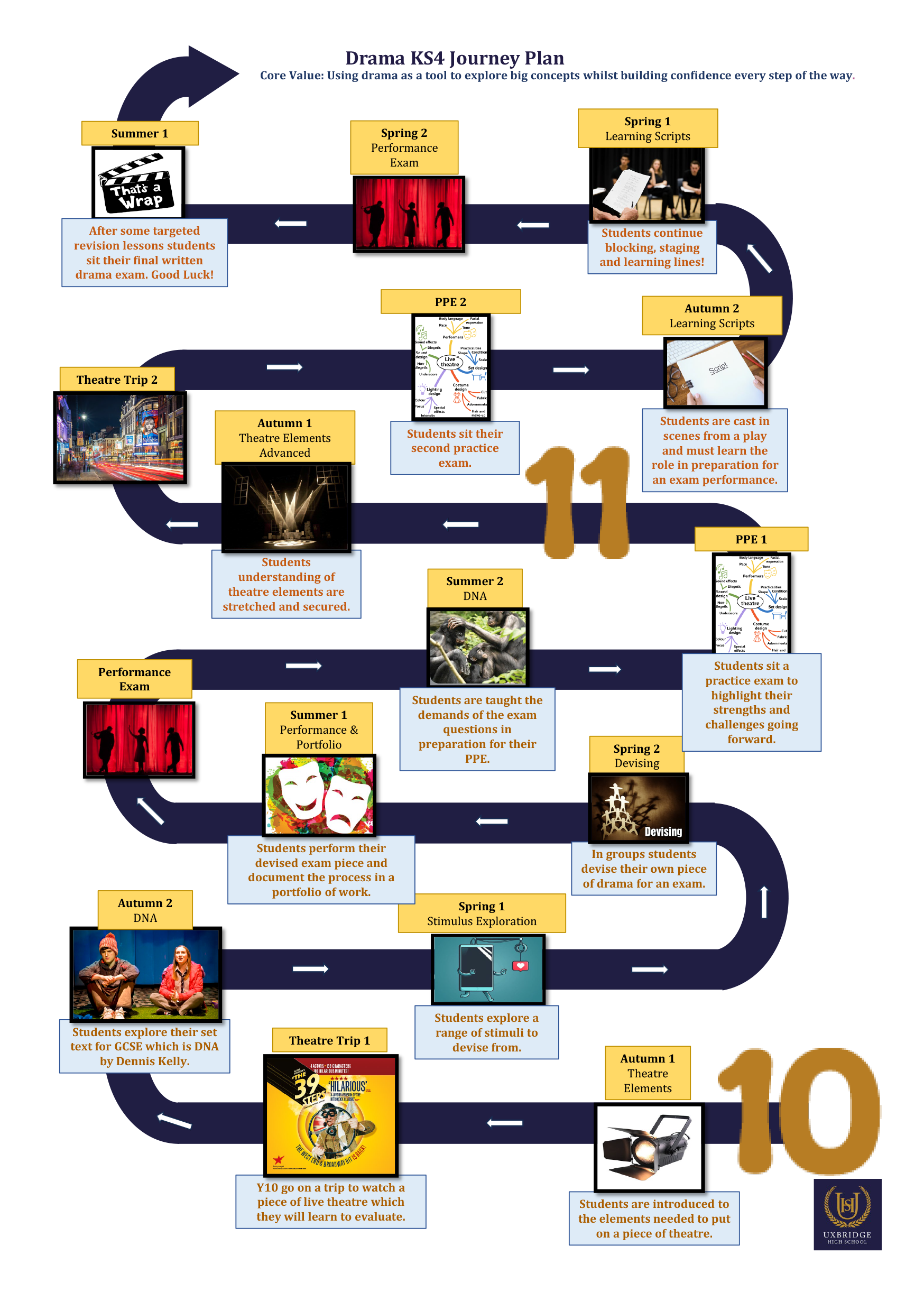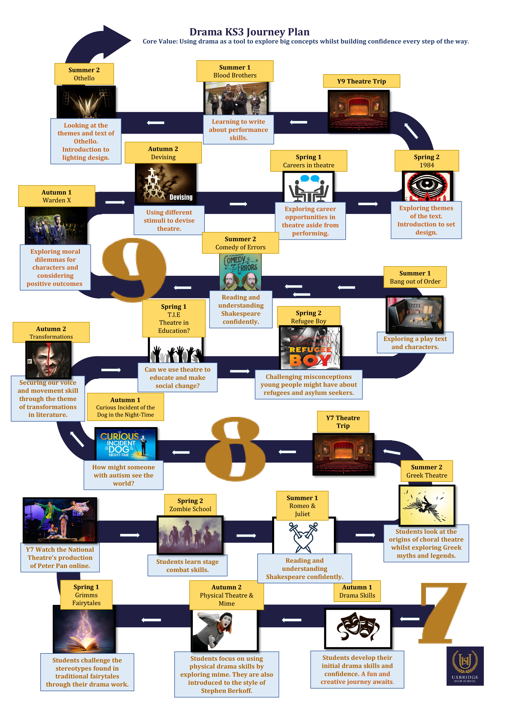 Students will have the opportunity to engage with the professional world of theatre and performance through visits to live theatre productions throughout the year. They will also be encouraged to participate in after school drama clubs and theatre enrichment sessions. The highlight of the year will be the school production for students to engage with. We thoroughly encourage students to get involved with the backstage and front of house roles as well as performing on stage to guarantee we offer a range of opportunities and experiences.ent