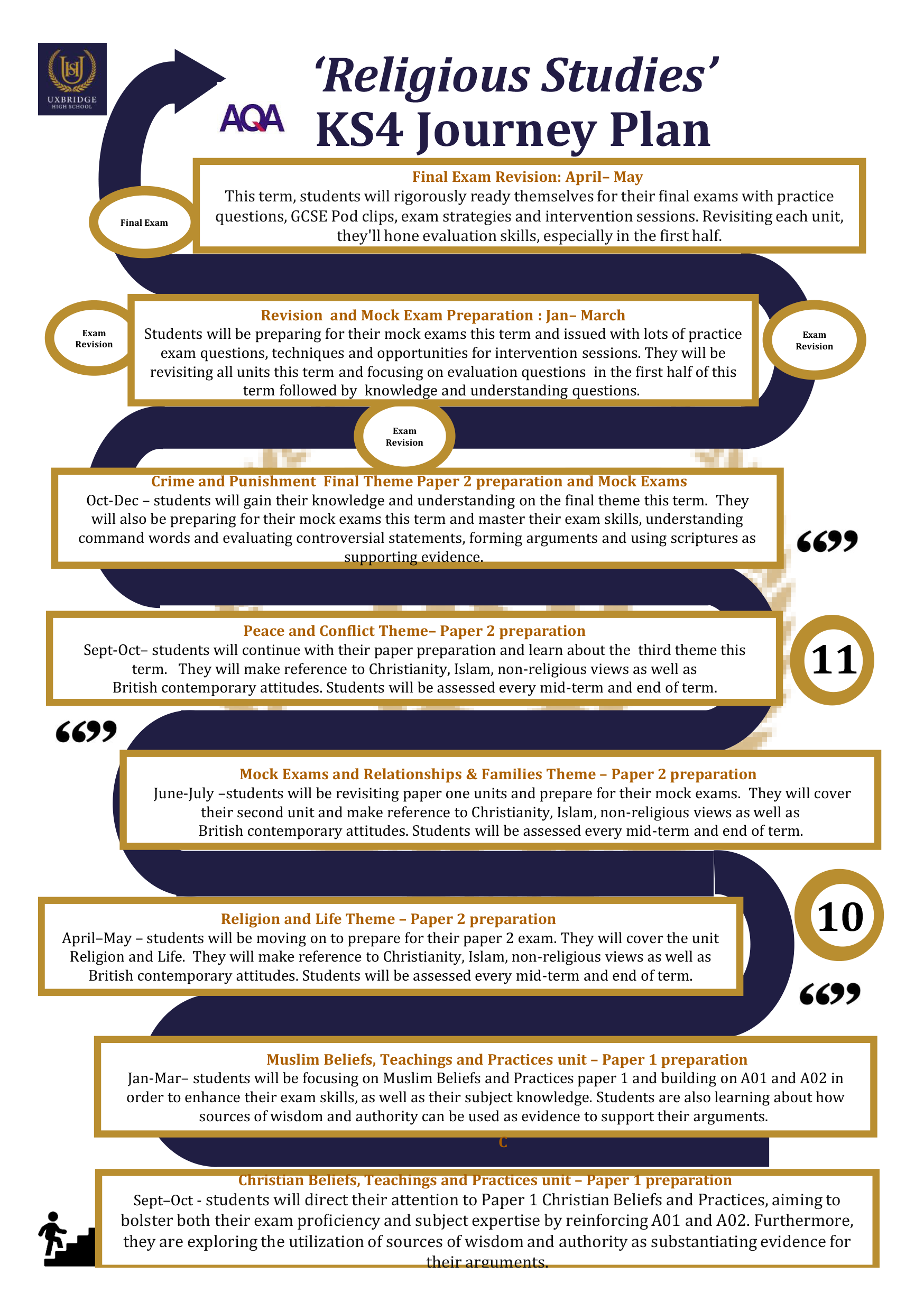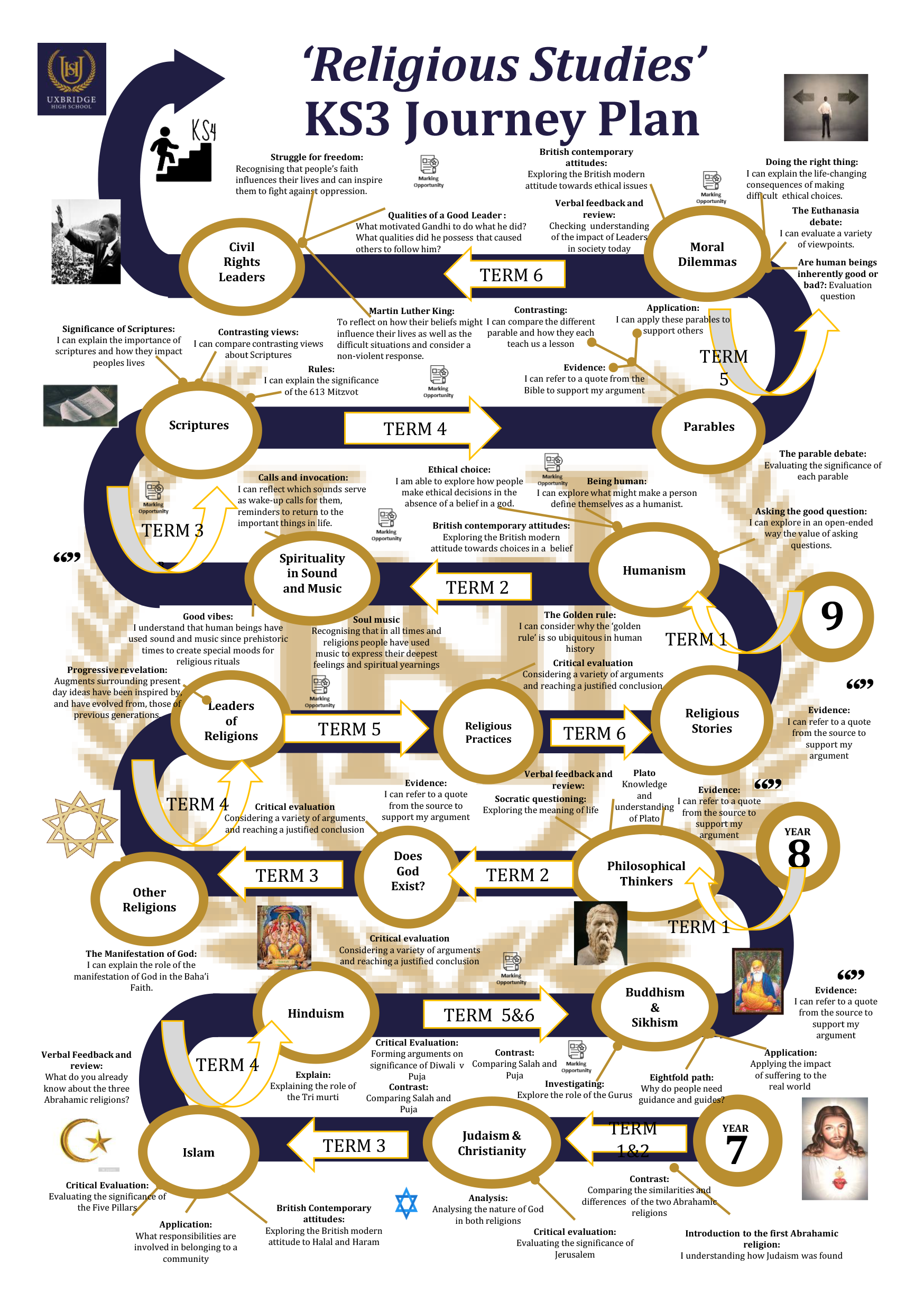 RE: Religious Education curriculum is designed to allow students to explore a wide range of topics which will allow them to self-reflect, analyse and evaluate religious, ethical and philosophical ideas and viewpoints. Throughout the five years, students will cover topics such as the Abrahamic story, what are morals? and the importance of religious pilgrimages.